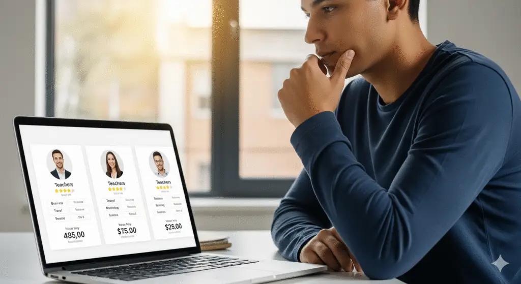 Basándonos en tu perfil, te presentaremos una selección personalizada de profesores certificados Vive-ELE. Podrás ver sus especialidades, metodologías, horarios disponibles y honorarios claros y transparentes.