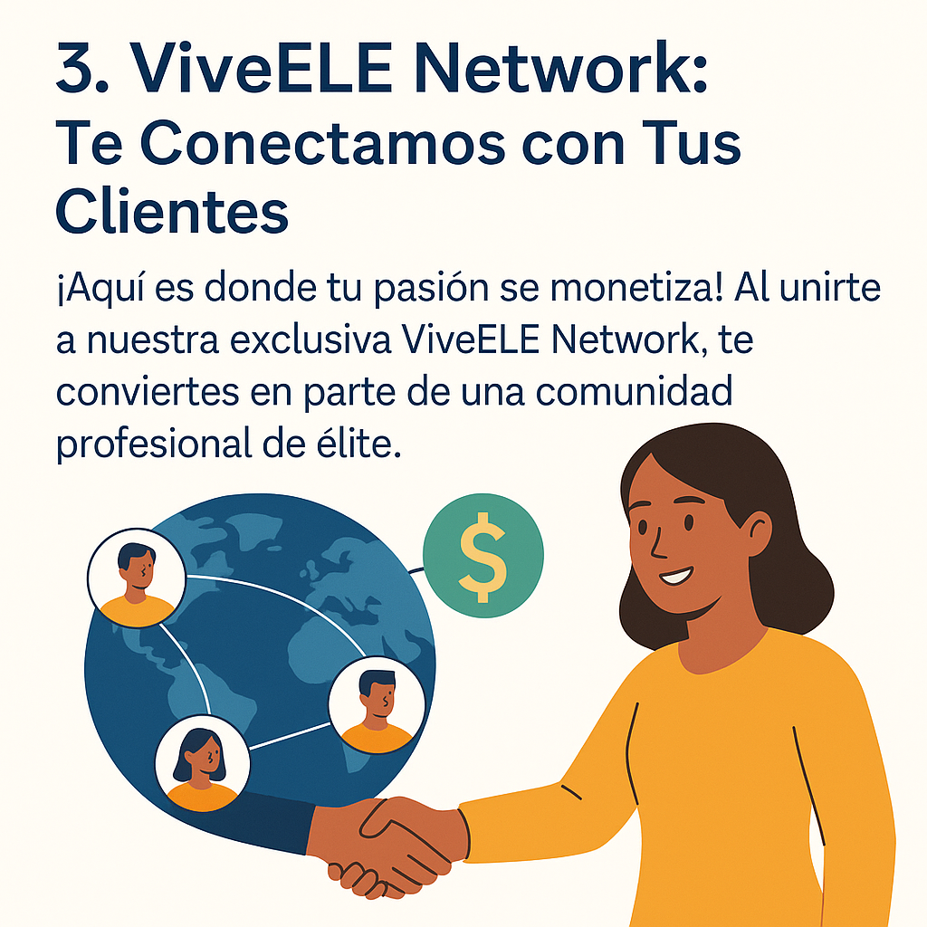 ¡Aquí es donde tu pasión se monetiza! Al unirte a nuestra exclusiva Vive-ELE Network, te conviertes en parte de una comunidad profesional de élite. Crea tu perfil personalizado, define tus precios, horarios y modalidades (clases presenciales u online). Lo más importante: te enviamos clientes que buscan exactamente tu perfil. Además, tendrás tu propio escaparate en nuestro Vive-ELE Marketplace, donde miles de estudiantes de todo el mundo podrán encontrarte, seleccionarte y reservar tus clases. ¡Olvídate de buscar, nosotros te conectamos con el mundo y te ayudamos a construir una agenda llena de alumnos!