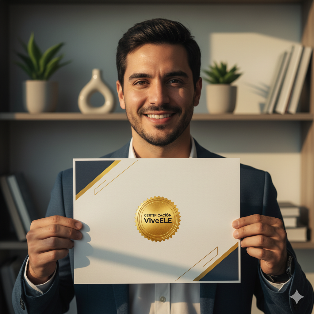Tu inversión se traduce en reconocimiento. Obtén tu Certificación Vive-ELE Academy, un sello de calidad que te distingue en el mercado global. Pero no nos detenemos ahí: hemos diseñado un sistema de progresión por niveles (Básico → Avanzado → Pro) que te impulsa a la excelencia. Cada nivel no solo valida tus habilidades, sino que te abre las puertas a nuevas especializaciones de alta demanda (ELE para Negocios, Niños, Integración, etc.) y te prepara para captar alumnos más exigentes, permitiéndote incrementar tus tarifas y tu valor como profesional. ¡Tu potencial de ingresos y crecimiento está directamente ligado a tu nivel de expertise Vive-ELE!